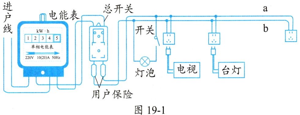 1. 某同学家的电路简化后如图19-1所示,由该电路可知( )。