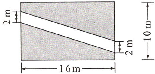 3. 如图,一块长方形草地的长是16米,宽是10米,中间铺了一条平行四边形石子路。草坪(涂色部分)的面积是多少平方米?