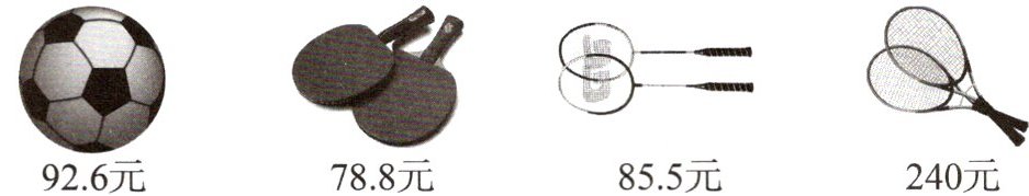 答:一副羽毛球拍比一副乒乓球拍贵6.7元。 一只足球比一副网球拍便宜147.4元。