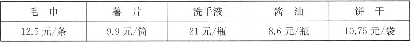 答:妈妈最多可以买4种商品,买一条毛巾、一筒薯片、一瓶酱油和一袋饼干。