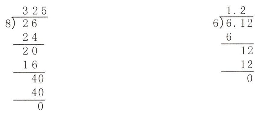 $\begin{array}{r} 325\\ 8\enclose{longdiv} {26}\\ 24\\ \hline 20\\ 16\\ \hline 40\\ 40\\ \hline 0\end{array} $