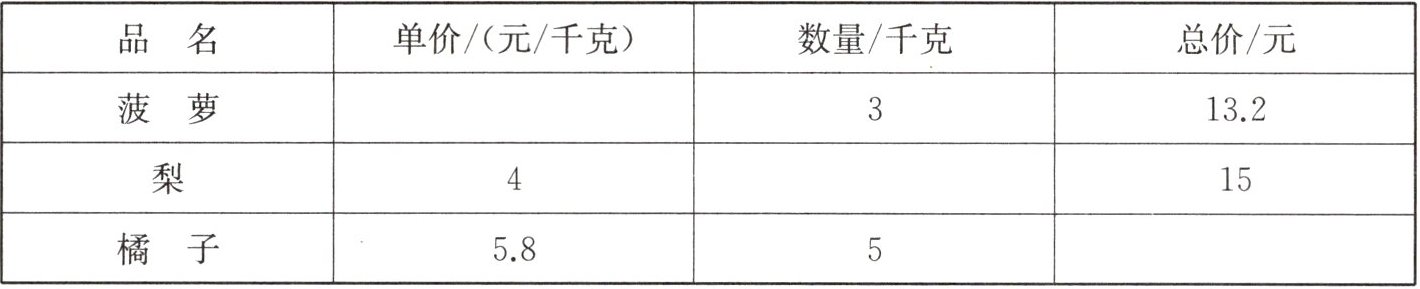 | 品名 | 单价/(元/千克) | 数量/千克 | 总价/元 |