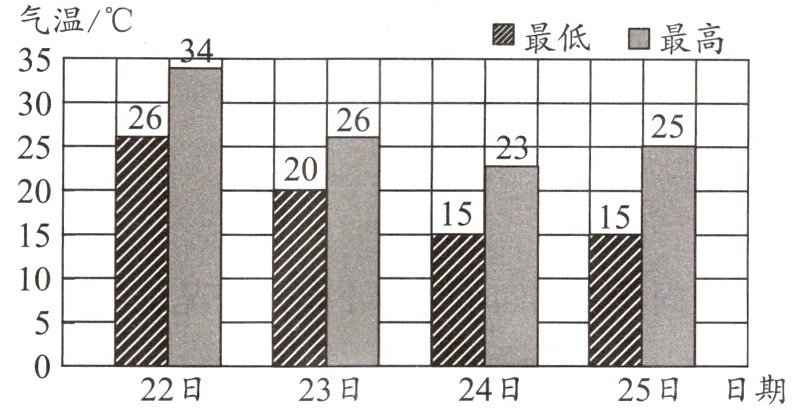 (2)22日至25日中,温差(最高气温和最低气温的差)最大的是( )日,温差最小的是( )日。