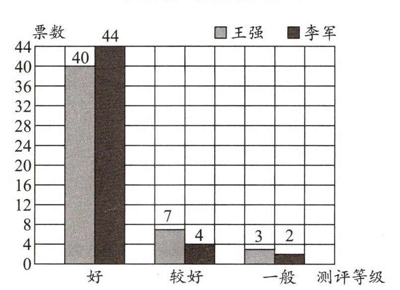 3. 某班竞选班长,为了在最终候选人王强和李军中选出班长,进行了演讲与民主测评两项活动。A、B、C、D、E五位老师作为评委对王强、李军的演讲情况打分,该班50名同学分别对王强和李军按“好”“较好”“一般”三个等级进行民主测评,统计结果如下面的图表。计分规则: