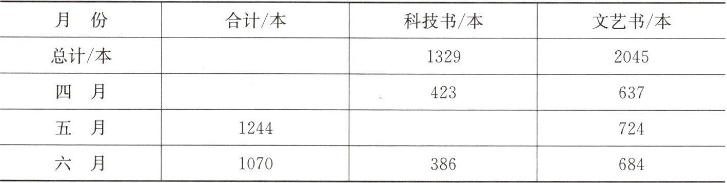 |月份|合计/本|科技书/本|文艺书/本|