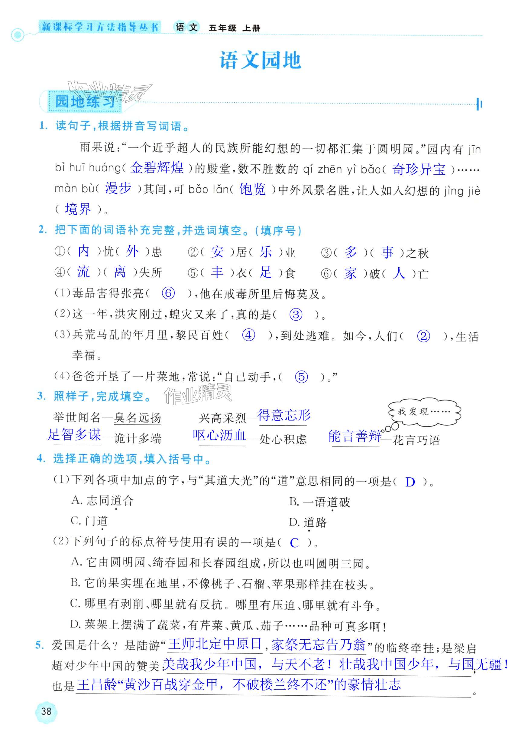 注:目前有些书本章节名称可能整理的还不是很完善,但都是按照顺序排列的,请同学们按照顺序仔细查找。练习册 2024年新课标学习方法指导丛书五年级语文上册人教版 答案主要是用来给同学们做完题方便对答案用的,请勿直接抄袭。
