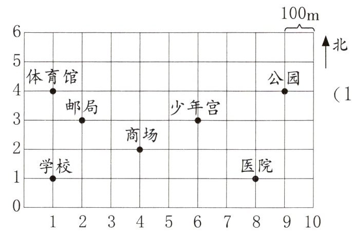 (1)答:药房在(2,1)处,从药房出发往西100m,再往北200m处是车站,