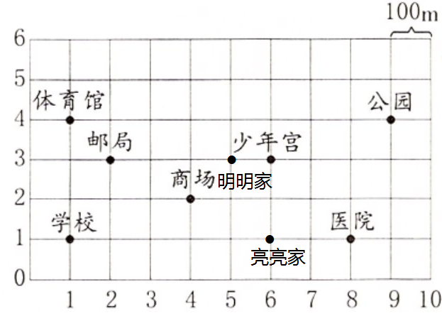 (2)亮亮家在商场以东200m,再往南100m处;明明家在医院以西300m,再往北200m处。在图中标出这两位同学家的位置。