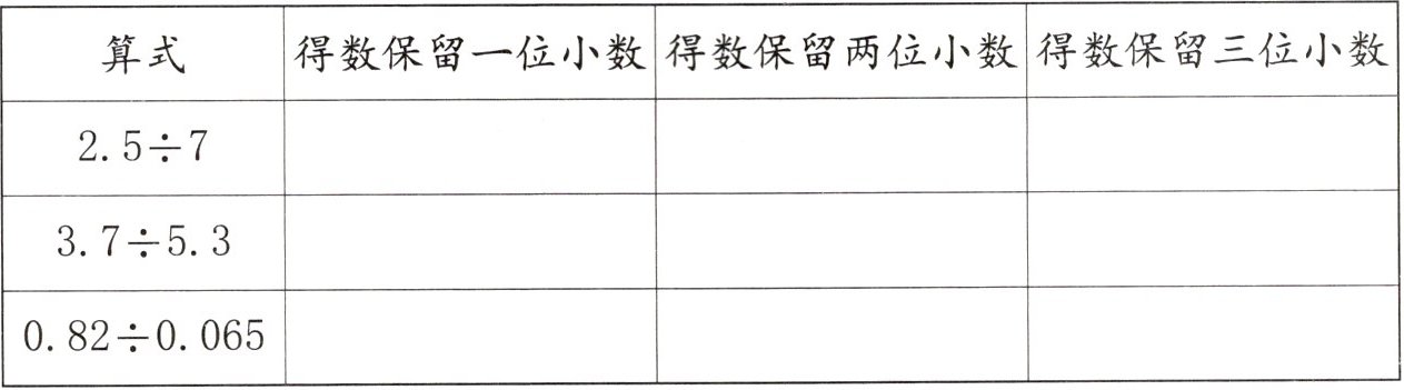 2. 先算出商,再用“四舍五入”法按要求取其近似数,填入下表。