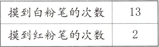 3. 老师的粉笔盒里有10支白粉笔和2支红粉笔。摸出一支,猜一猜,摸出哪种颜色的可能性大?每次摸后放回,摸15次,记录的结果如下。