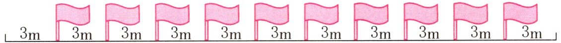 2. 操场旁边的一条小路一侧插着10面彩旗,每相邻两面彩旗之间的距离是3m(两端都不插,如下图)。这条小路有多长?