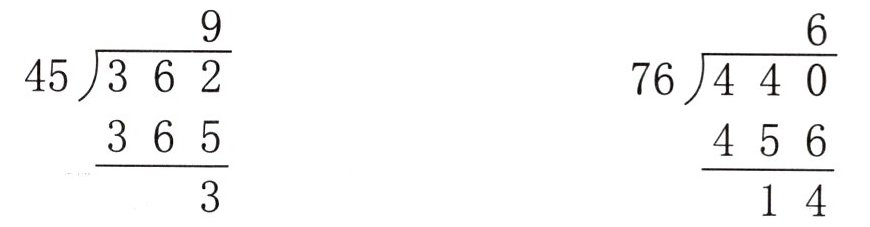 $\begin{array}{r}9 \\45\enclose{longdiv}{362} \\\underline{365} \\3\end{array} $