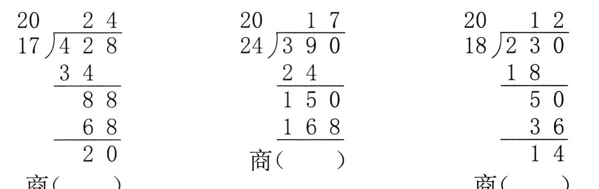 $ \begin{array}{r} 17 \\ 24 \enclose{longdiv}{390} \\ 24 \\ \hline 150 \\ 168 \\ \hline 商( ) \end{array} $