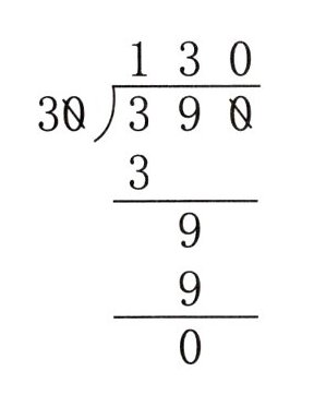 $ \begin{array}{r} 130 \\ 30 \enclose{longdiv}{390} \\ 3 \\ \hline 9 \\ 9 \\ \hline 0 \end{array} $