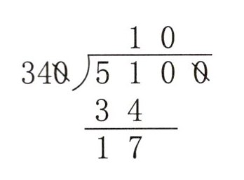 $ \begin{array}{r} 10 \\ 34 \enclose{longdiv}{510} \\ 34 \\ \hline 17 \end{array} $