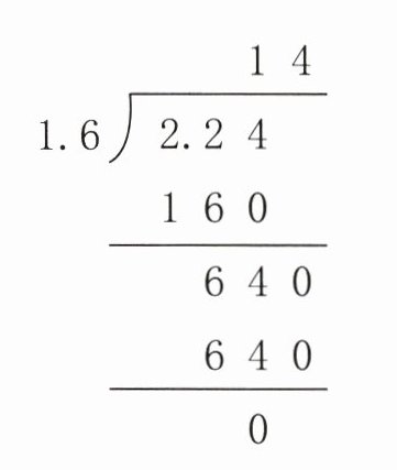 $\end{array}$ $$\begin{array}{r}$14 \\$1.6\enclose{longdiv}{2.24} \\$$\underline{160} \\$640 \\$\underline{640} \\$0$\end{array}$ $