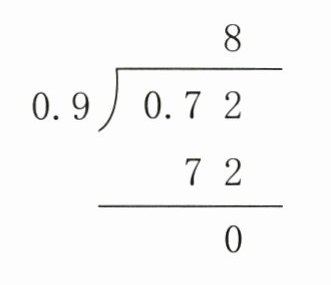将除数0.9扩大10倍为9,被除数0.72同时扩大10倍为7.2,按整数除法计算: