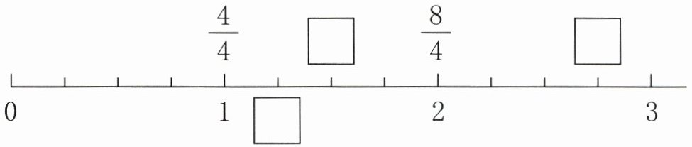上面的假分数从左到右:$\frac{4}{4}$(已给出),$\frac{5}{4}$(第二个空),$\frac{8}{4}$(已给出),$\frac{11}{4}$(第四个空)。