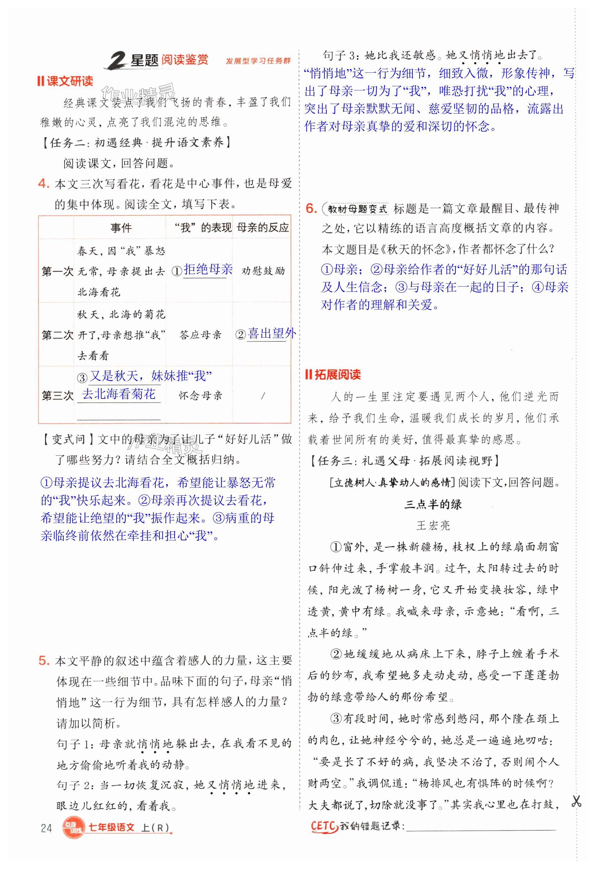 注:目前有些书本章节名称可能整理的还不是很完善,但都是按照顺序排列的,请同学们按照顺序仔细查找。练习册 2024年点拨训练七年级语文上册人教版 答案主要是用来给同学们做完题方便对答案用的,请勿直接抄袭。