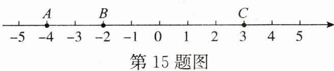 15. 如图所示,在数轴上有三个点 $A$,$B$,$C$,请回答下列问题: