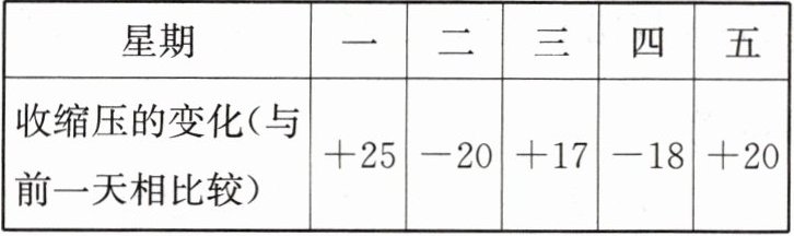 |收缩压的变化(与前一天相比较)|$+25$|$-20$|$+17$|$-18$|$+20$|