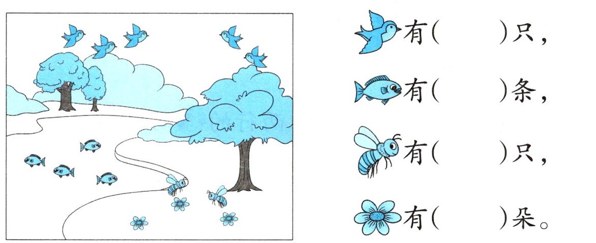 🐦有()只, 🐟有()条, 🐝有()只, 🌸有()朵。