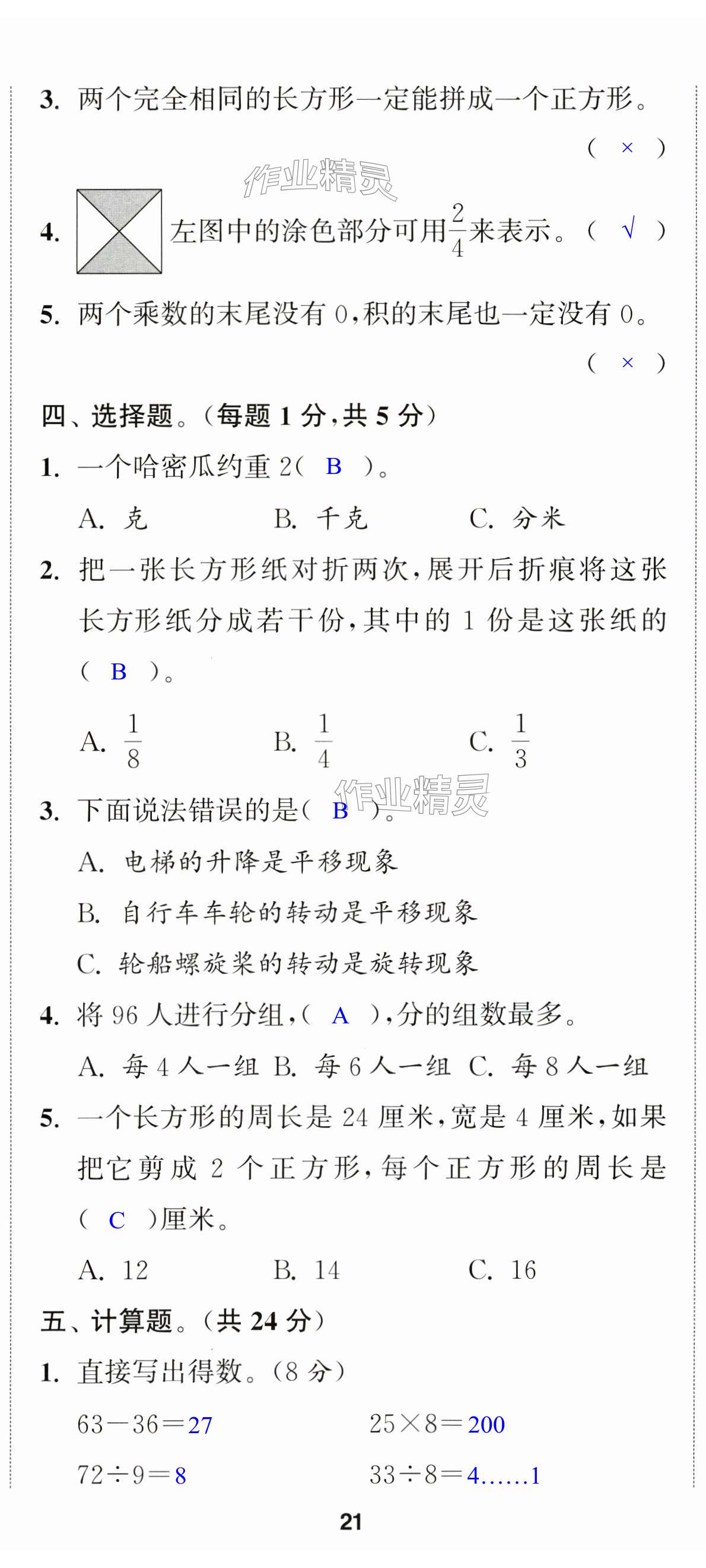 注:目前有些书本章节名称可能整理的还不是很完善,但都是按照顺序排列的,请同学们按照顺序仔细查找。练习册 2024年通成学典课时作业本三年级数学上册苏教版苏州专版 答案主要是用来给同学们做完题方便对答案用的,请勿直接抄袭。
