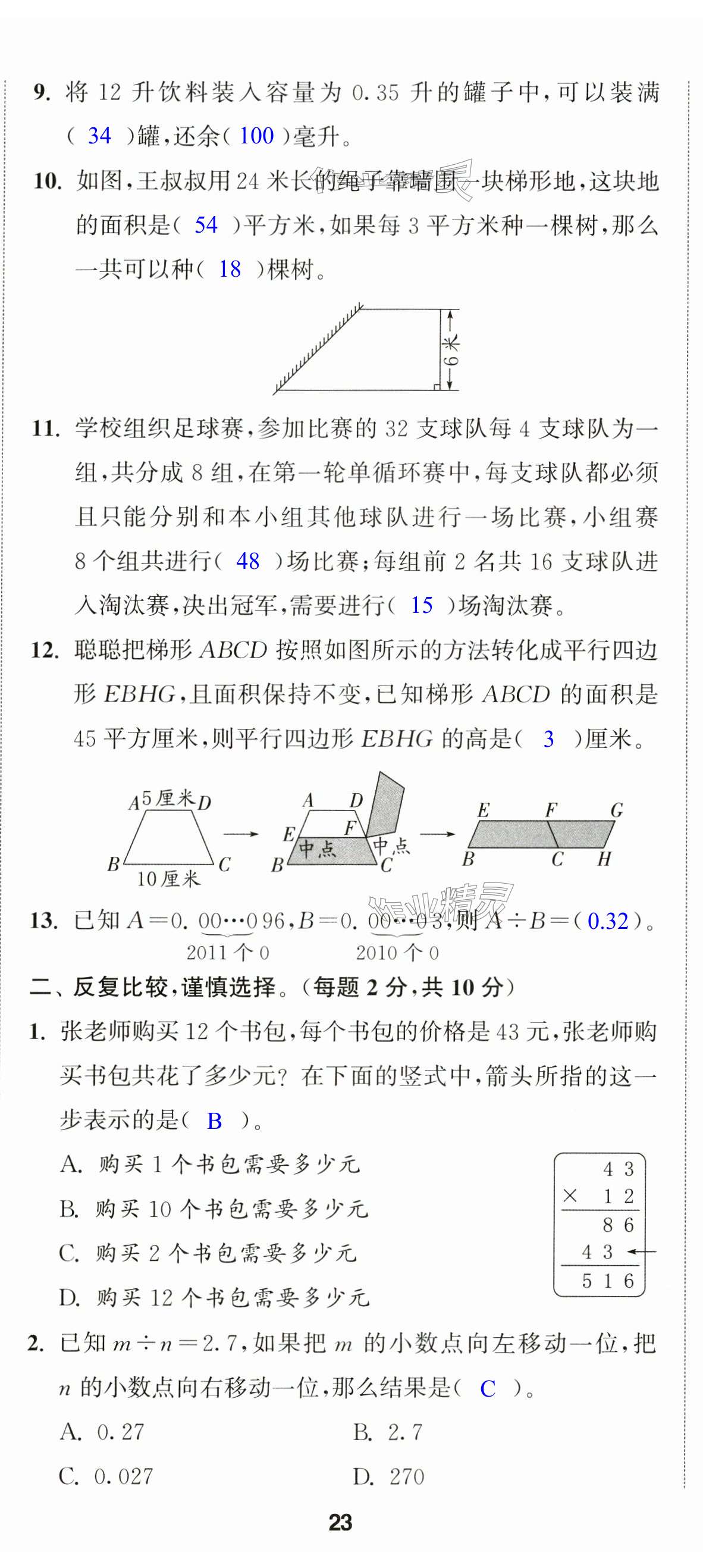 注:目前有些书本章节名称可能整理的还不是很完善,但都是按照顺序排列的,请同学们按照顺序仔细查找。练习册 2024年通成学典课时作业本五年级数学上册苏教版苏州专版 答案主要是用来给同学们做完题方便对答案用的,请勿直接抄袭。
