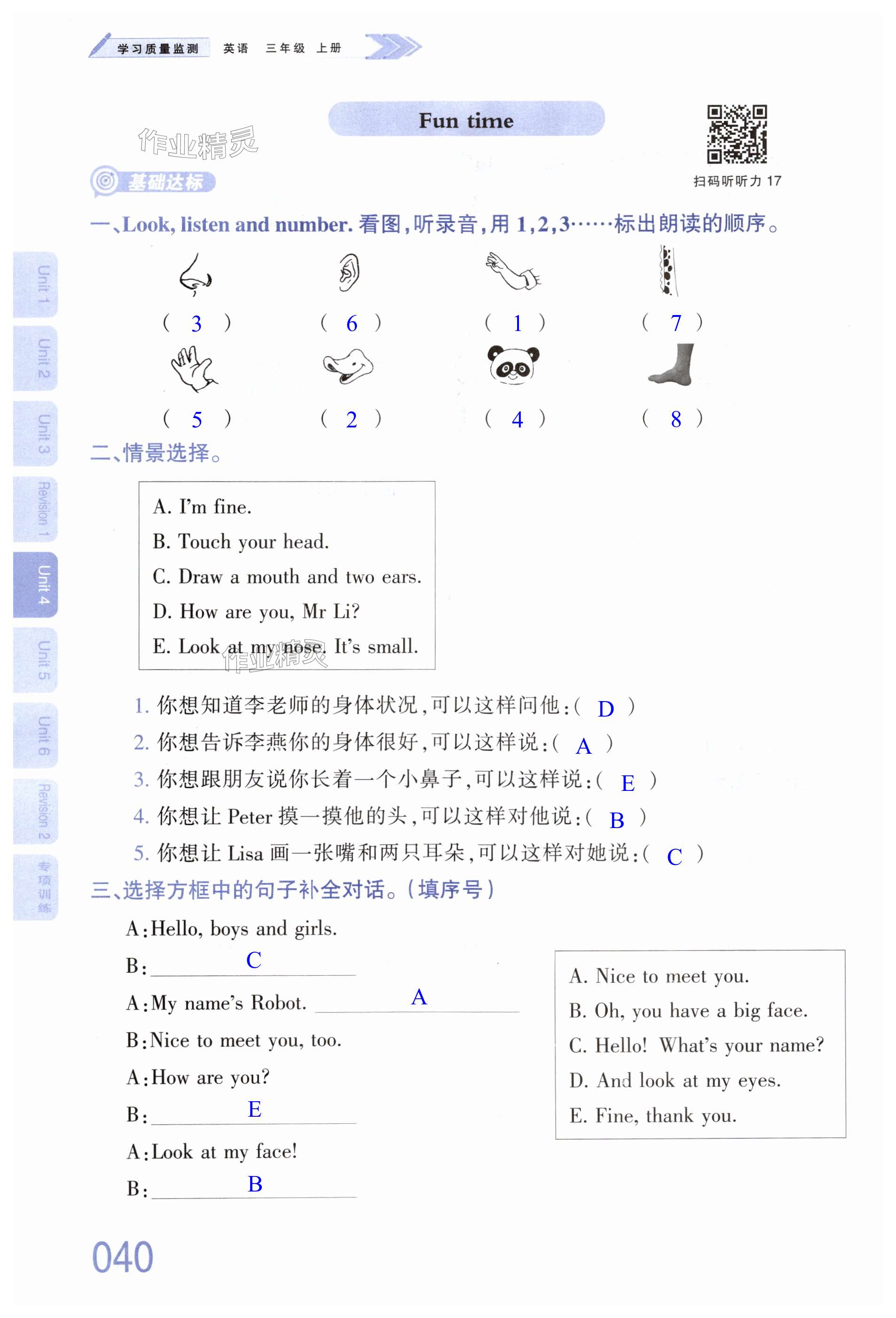 注:目前有些书本章节名称可能整理的还不是很完善,但都是按照顺序排列的,请同学们按照顺序仔细查找。练习册 2024年学习质量监测三年级英语上册人教版 答案主要是用来给同学们做完题方便对答案用的,请勿直接抄袭。