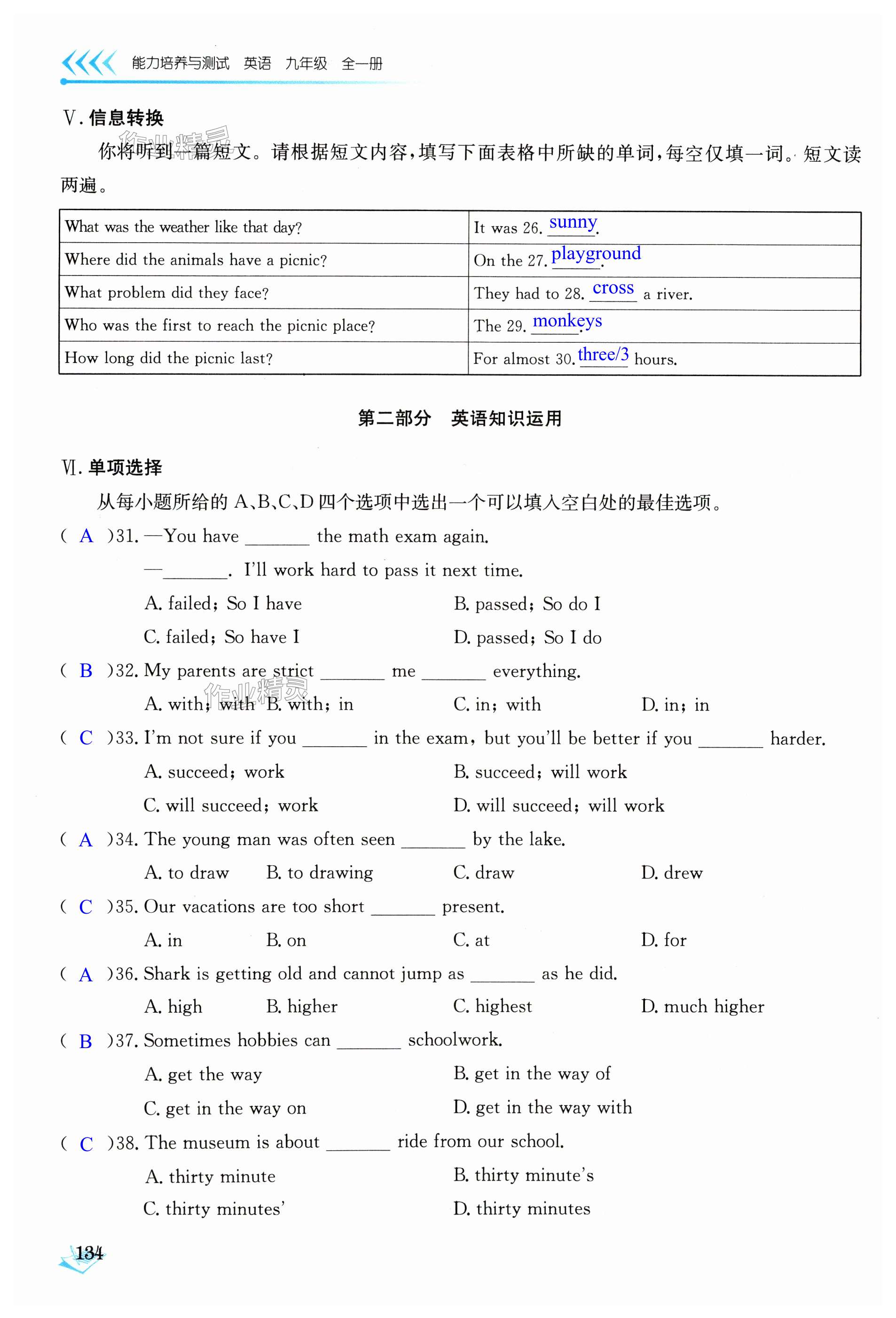 注:目前有些书本章节名称可能整理的还不是很完善,但都是按照顺序排列的,请同学们按照顺序仔细查找。练习册 2024年能力培养与测试九年级英语全一册人教版 答案主要是用来给同学们做完题方便对答案用的,请勿直接抄袭。