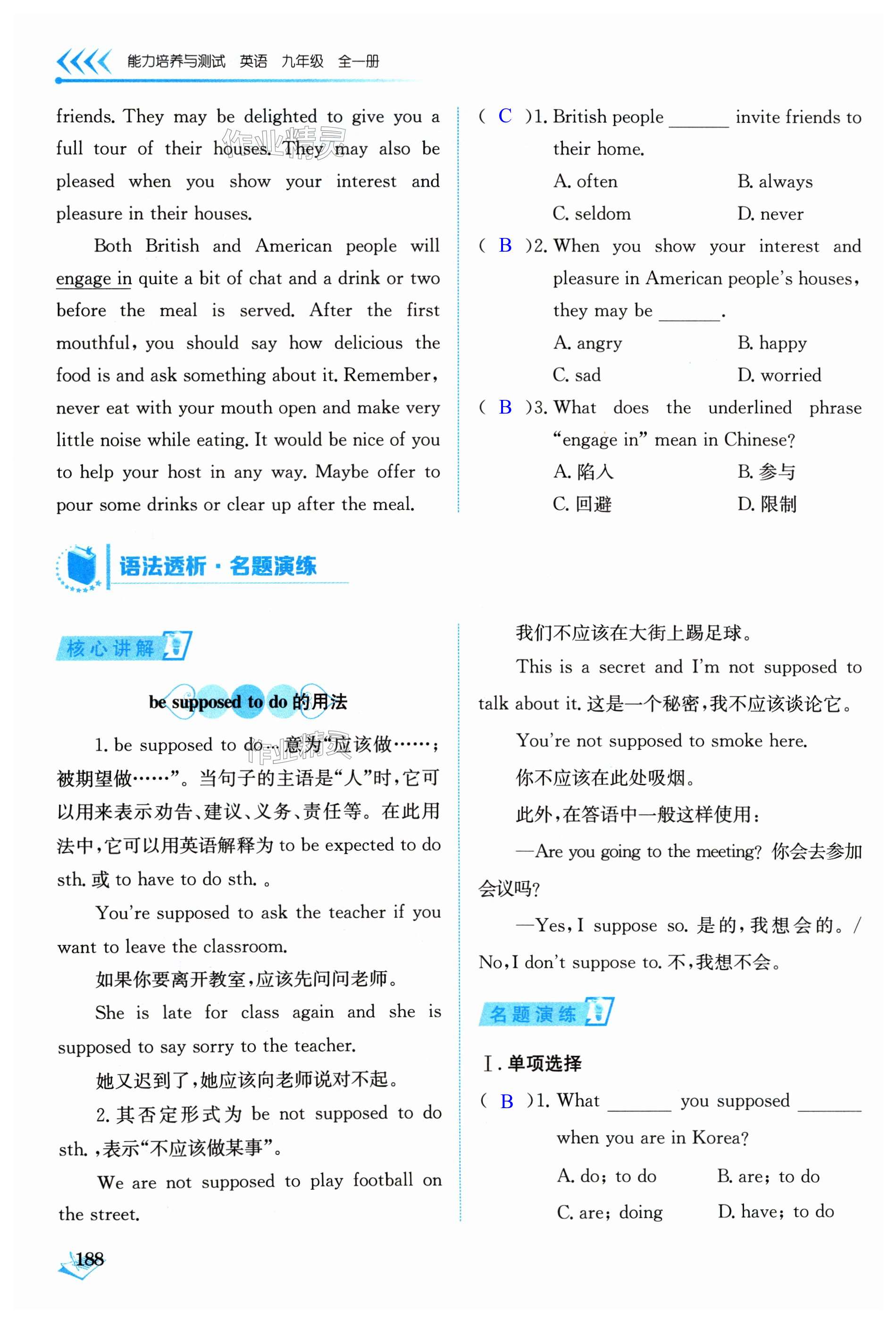 注:目前有些书本章节名称可能整理的还不是很完善,但都是按照顺序排列的,请同学们按照顺序仔细查找。练习册 2024年能力培养与测试九年级英语全一册人教版 答案主要是用来给同学们做完题方便对答案用的,请勿直接抄袭。