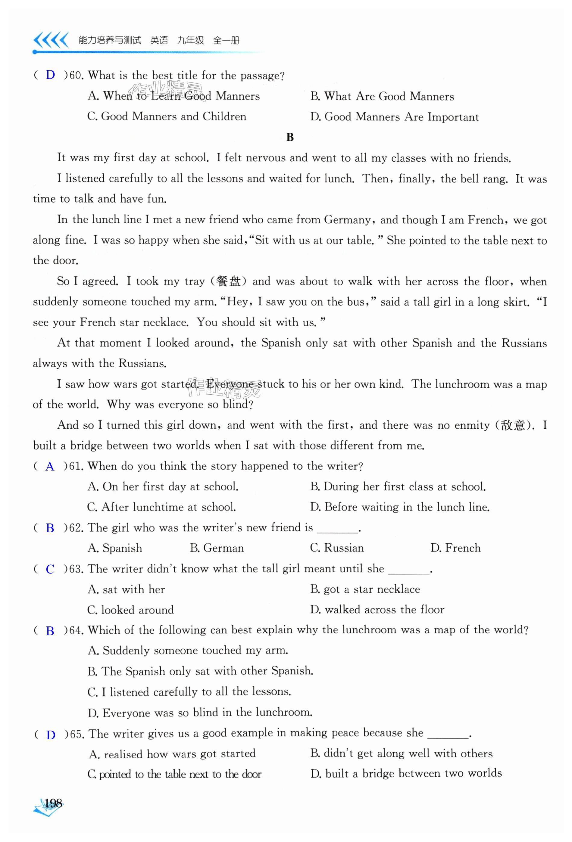 注:目前有些书本章节名称可能整理的还不是很完善,但都是按照顺序排列的,请同学们按照顺序仔细查找。练习册 2024年能力培养与测试九年级英语全一册人教版 答案主要是用来给同学们做完题方便对答案用的,请勿直接抄袭。