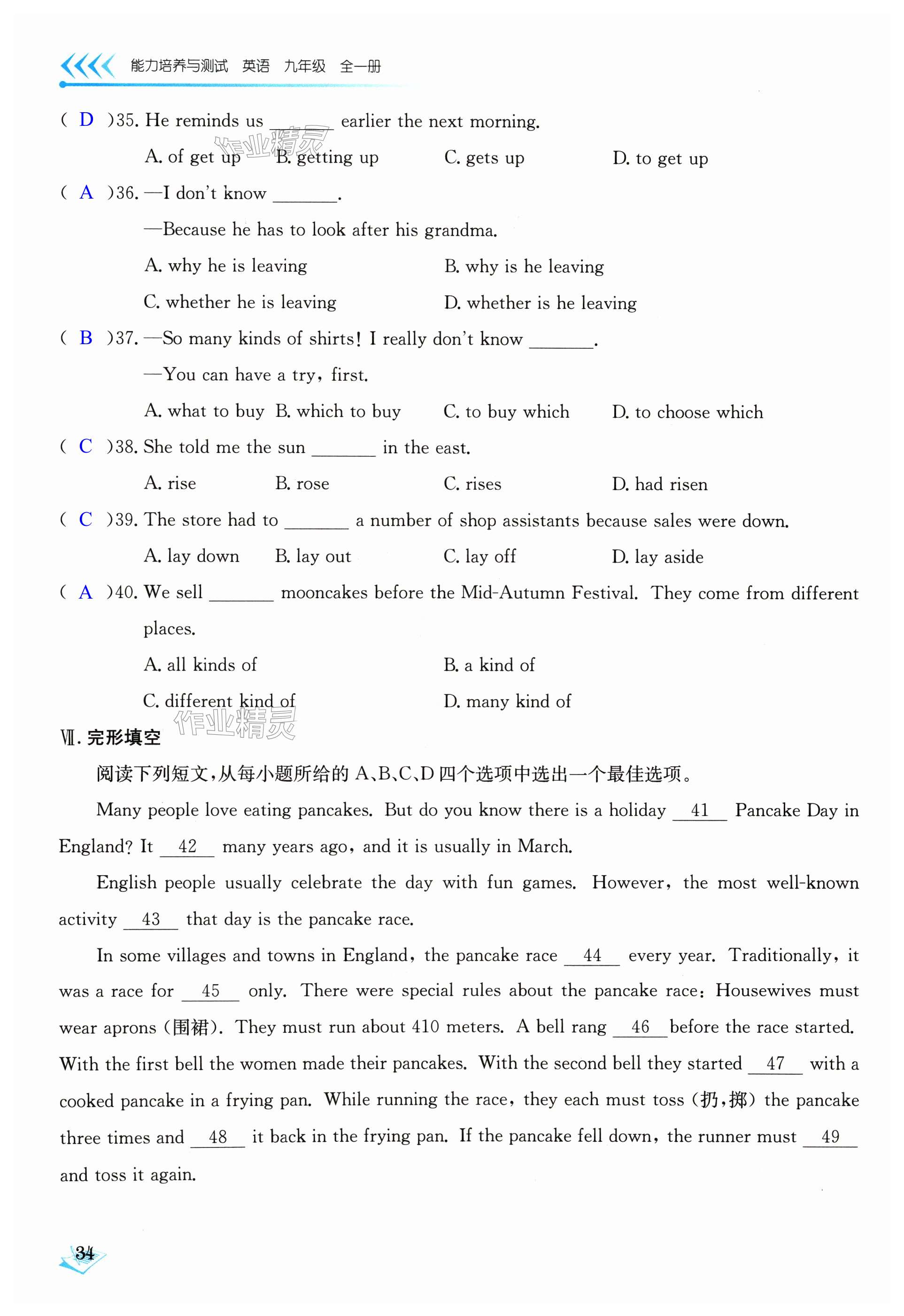 注:目前有些书本章节名称可能整理的还不是很完善,但都是按照顺序排列的,请同学们按照顺序仔细查找。练习册 2024年能力培养与测试九年级英语全一册人教版 答案主要是用来给同学们做完题方便对答案用的,请勿直接抄袭。