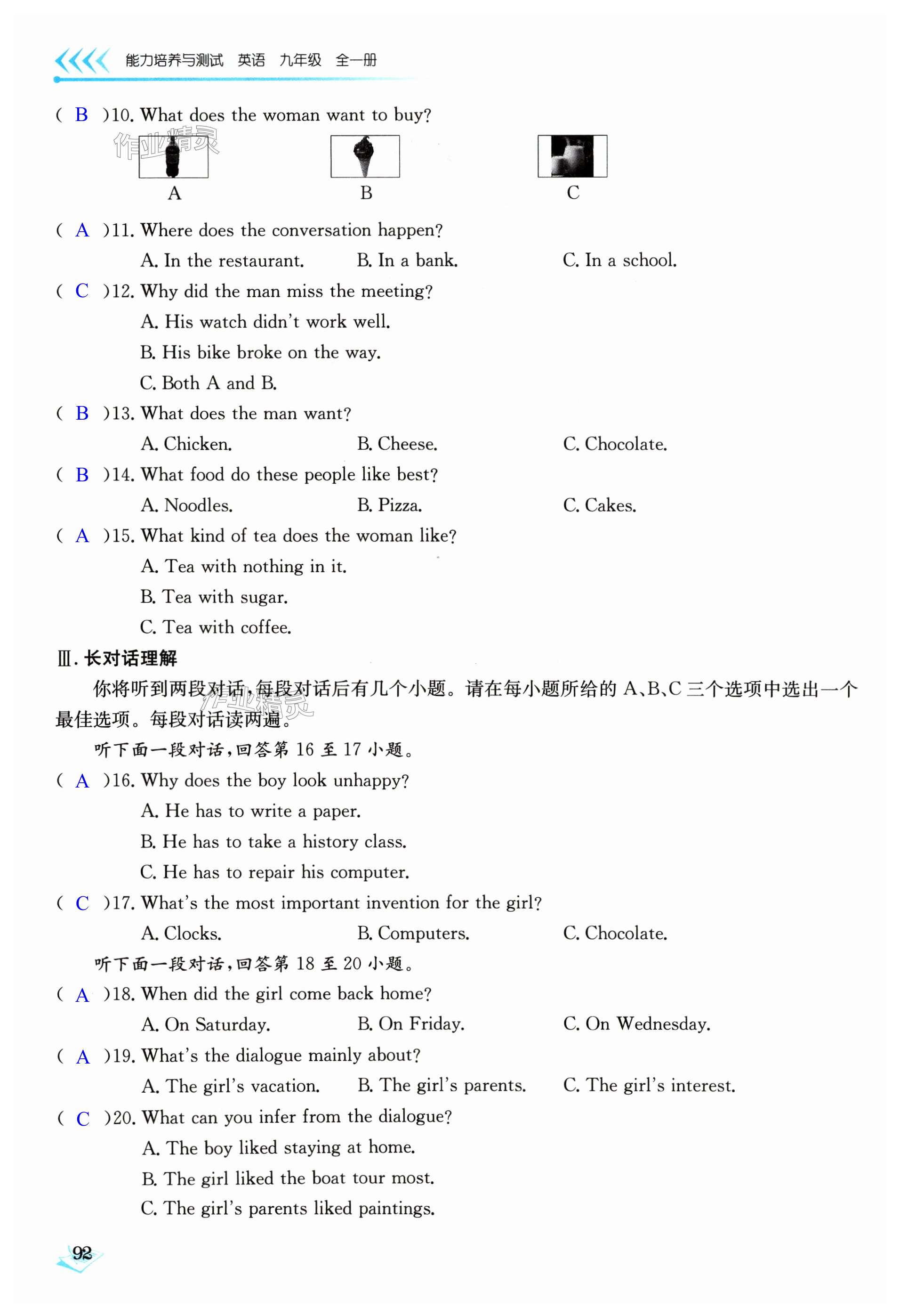 注:目前有些书本章节名称可能整理的还不是很完善,但都是按照顺序排列的,请同学们按照顺序仔细查找。练习册 2024年能力培养与测试九年级英语全一册人教版 答案主要是用来给同学们做完题方便对答案用的,请勿直接抄袭。