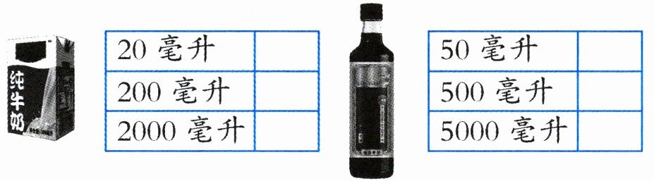 2. 下面容器的容量各是多少毫升?在合适答案的右边画“√”。