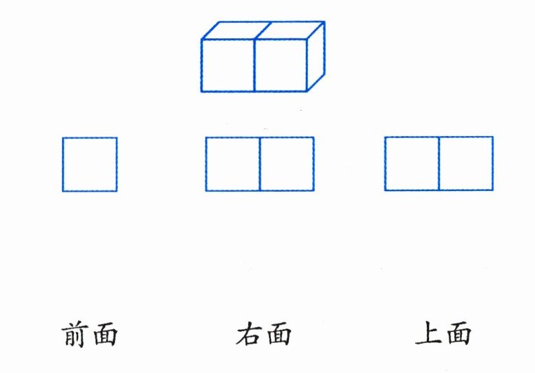 2. 用两个同样大的正方体摆一个长方体,分别从前面、右面和上面看到的图形如下,用线连一连。