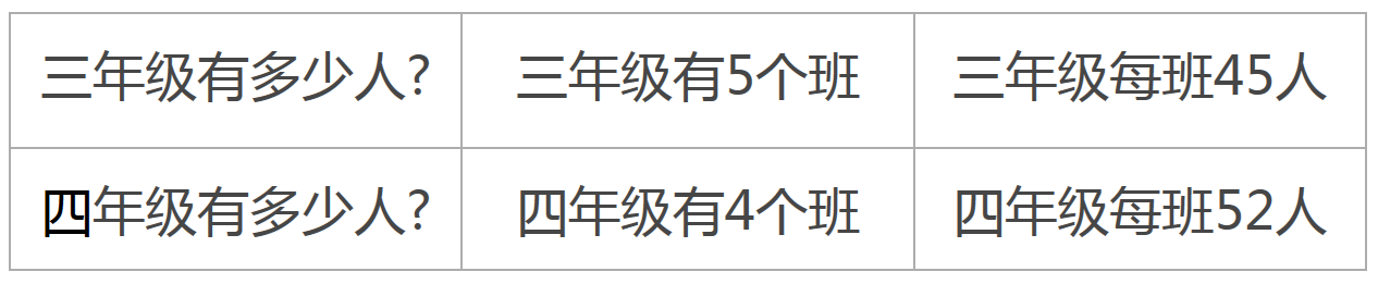 1. 光明小学三年级有5个班,四年级有4个班,五年级有3个班。三年级每班45人,四年级每班52人,五年级每班56人。