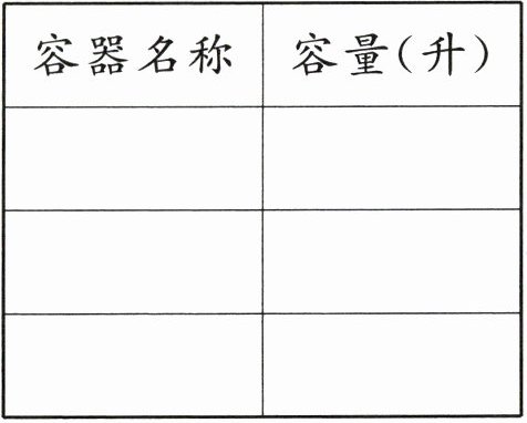 在生活中,哪些容器是用“毫升”作单位的?哪些容器是用“升”作单位的?选择几样分别记下它们的容量各是多少毫升或升。