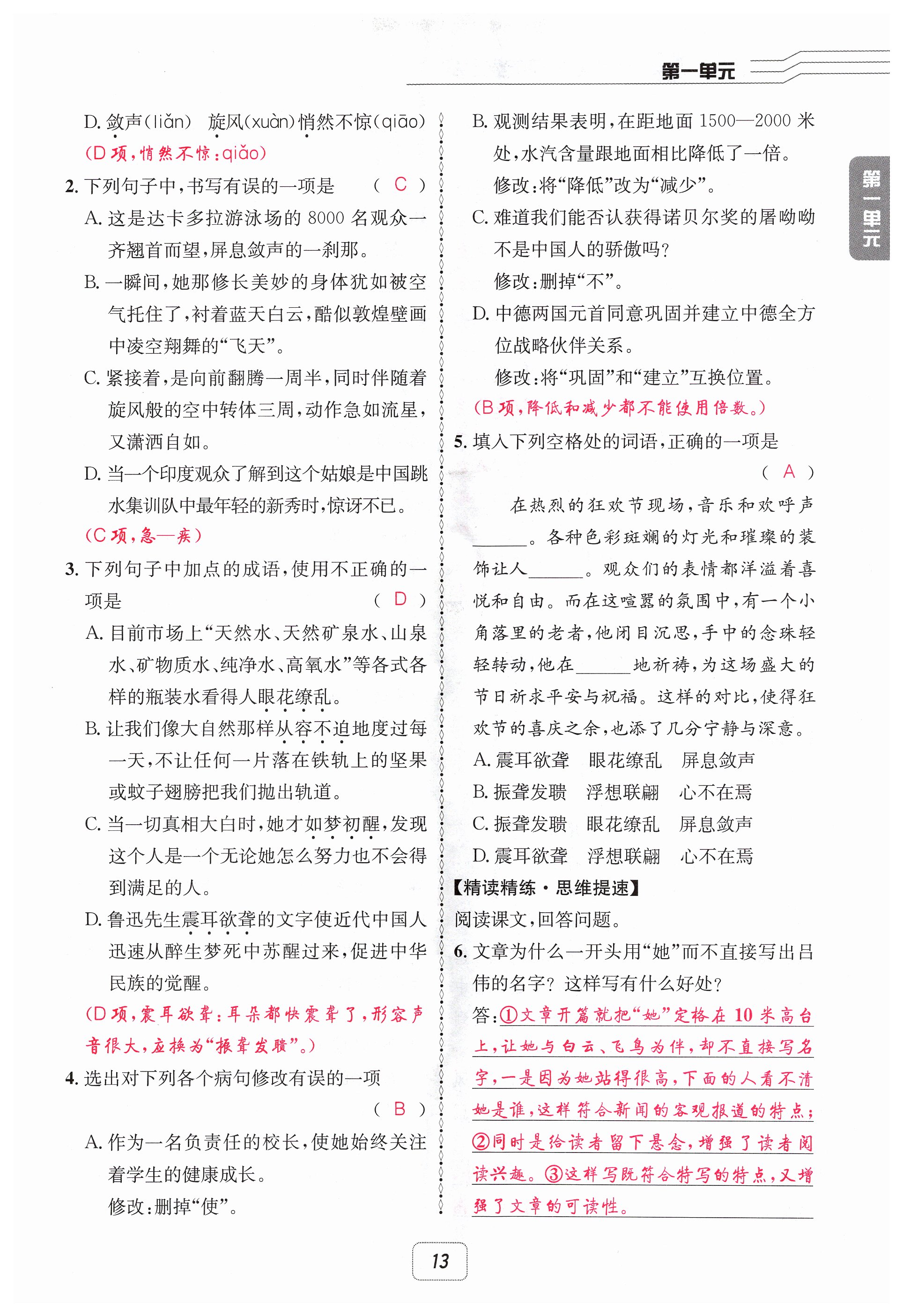 注:目前有些书本章节名称可能整理的还不是很完善,但都是按照顺序排列的,请同学们按照顺序仔细查找。练习册 2024年名校金典课堂八年级语文上册人教版成都专版 答案主要是用来给同学们做完题方便对答案用的,请勿直接抄袭。