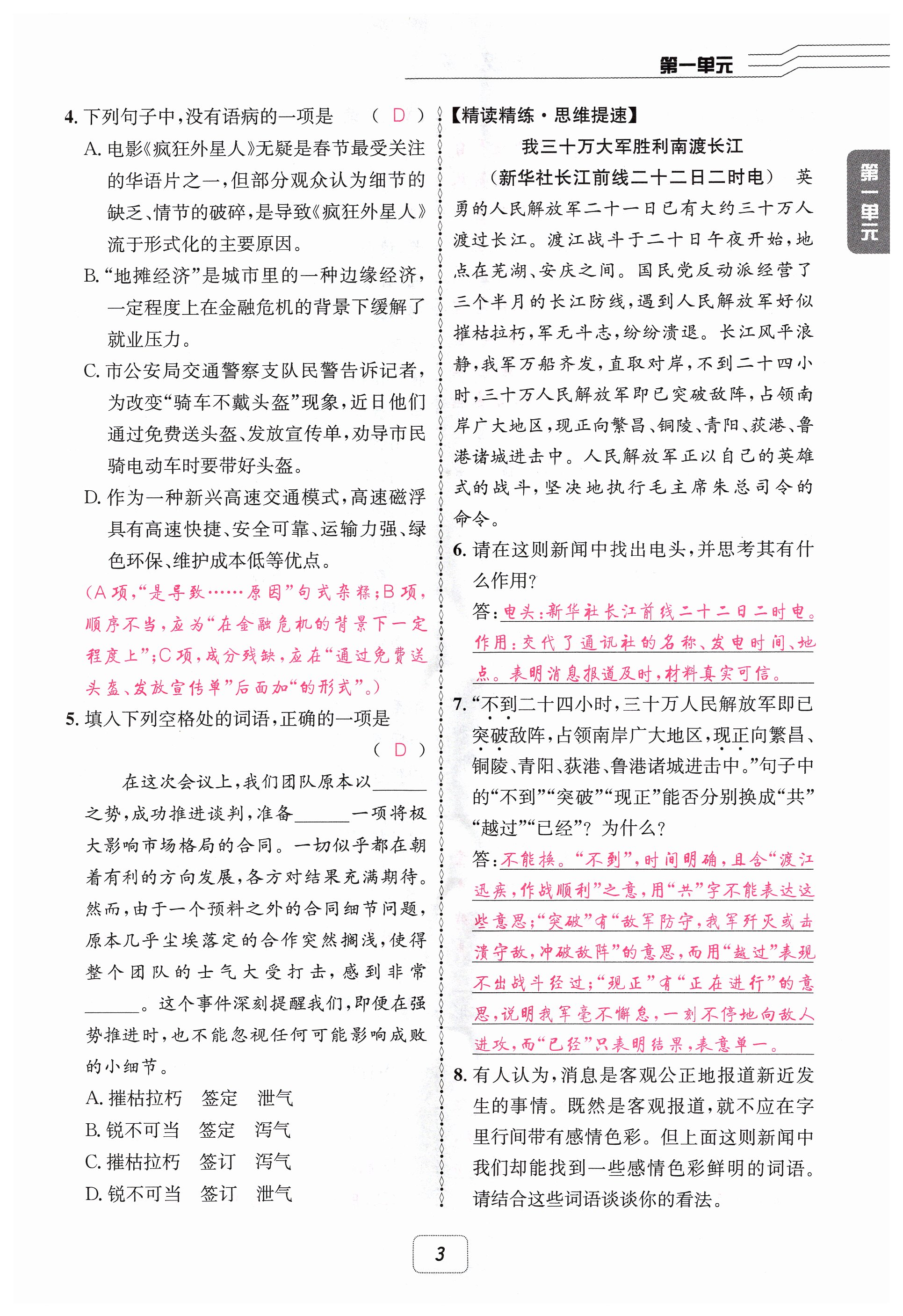 注:目前有些书本章节名称可能整理的还不是很完善,但都是按照顺序排列的,请同学们按照顺序仔细查找。练习册 2024年名校金典课堂八年级语文上册人教版成都专版 答案主要是用来给同学们做完题方便对答案用的,请勿直接抄袭。