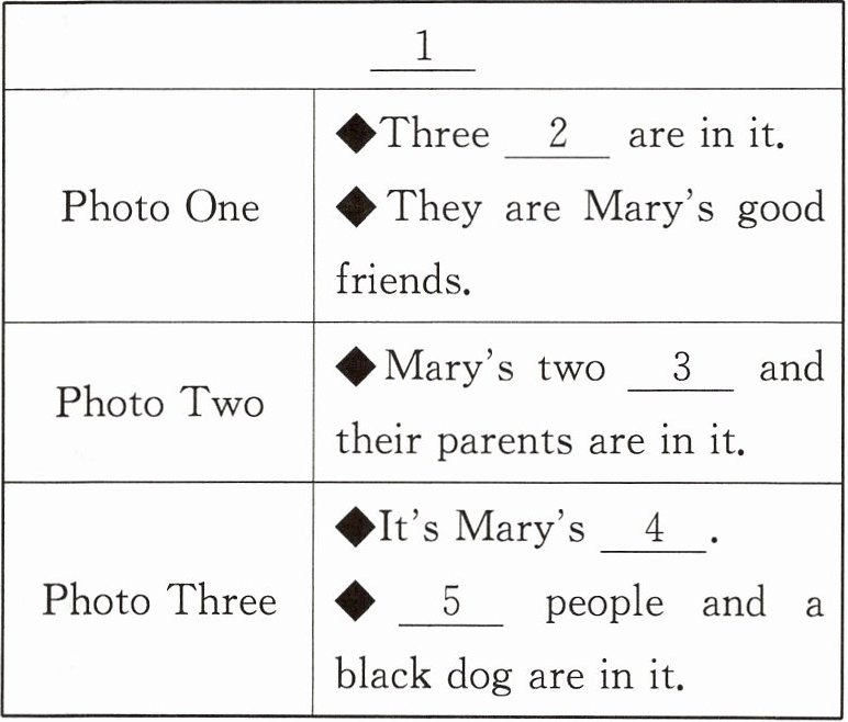 Hello! My name is Mary. I am 12 years old. Here are my three photos. In the first photo are Grace, Alice and Kate. They are my good friends. Look at the next photo. These are my aunt Sally and my uncle Peter. Those two boys are their sons. You can see my family in the last photo. These are my parents Frank and Cindy. The boy is my brother Dale and the girl in red is my sister Helen. Cici is Helen's dog. It is black. Who's the girl in purple? Haha! It's me.