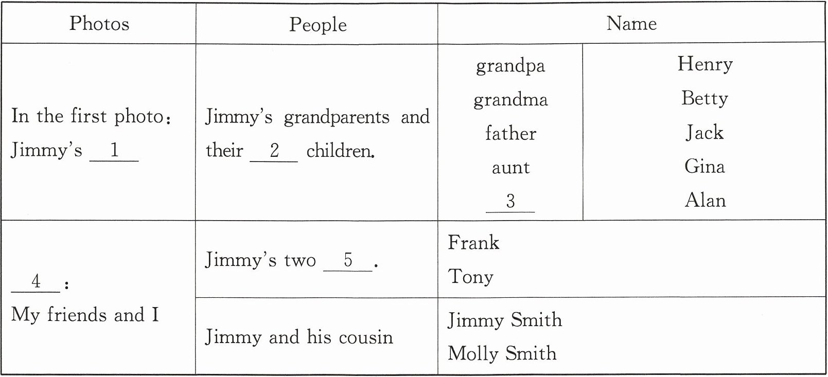 I am Jimmy. I have many nice photos. Here are two photos of my birthday party. The first is a photo of my family. These are my grandparents. My grandfather's name is Henry. My grandmother is Betty. They are 80 now. They have two sons and a daughter. My father is Jack. Alan is my uncle. My aunt is Gina. My good friends and I are in the next photo. The boys are Frank and Tony. They aren't in my school. They are from Beijing No. 10 Middle School. The girl in red is Molly and she is 13. Her family name is Smith. My family name is Smith, too. Molly is my cousin — my uncle's daughter. We are classmates.