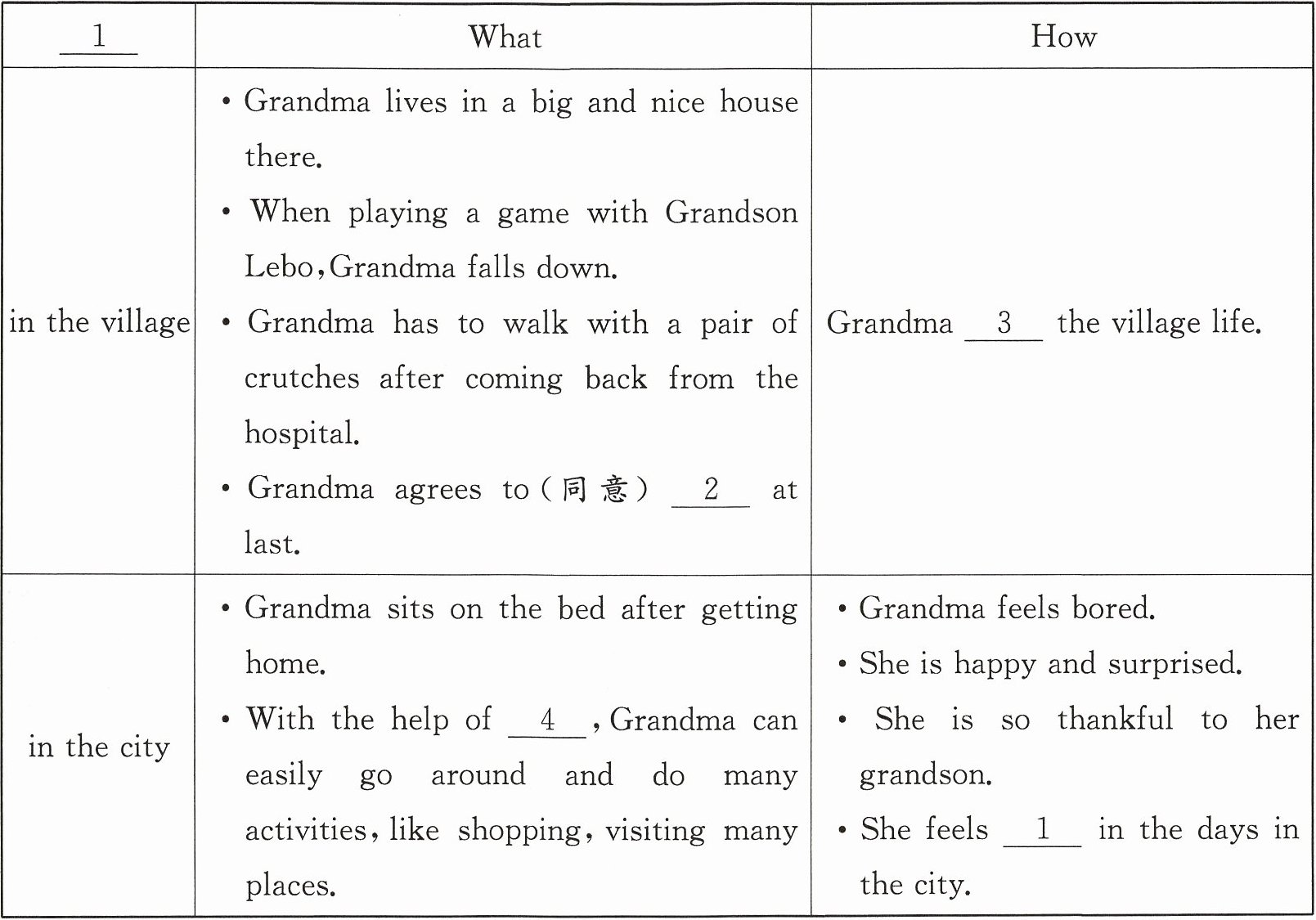 Lebo's grandma has a big and nice house in the village. There are many fruit trees around the house. "Now it's your turn to get me,grandma!" Lebo plays a game with Grandma. Grandma runs to Lebo but she falls down(跌倒). Lebo' mom takes her to the hospital. Soon,Grandma comes back with a pair of crutches(拐杖). "Mom,go to the town with us so that we can look after you," says Lebo's mom. "I don't want to leave my home. I love my life here." "Grandma,please go with us. I'm sure you will have fun there!" Lebo says. At last,Grandma says OK. Two hours later,Lebo's mom drives them home. Grandma sits on the bed and she feels bored. Then Lebo comes in."Grandma,I know what we can do today. We can go shopping in the supermarket. It's just behind our house. "I'm afraid I can't. You know my leg…" "Look at this,Grandma!" Lebo brings a cool wheel chair and Grandma can easily go around it. And in the next days,they go to the park not far from their home. Colourful flowers,green trees and clean air there make them happy. They also go to the museum and the library. To Grandma's surprise(惊讶),it's only a ten minutes' car ride from their home to these places. "Thank you,my dear Lebo! I enjoy the days here. It's interesting!" Grandma says.