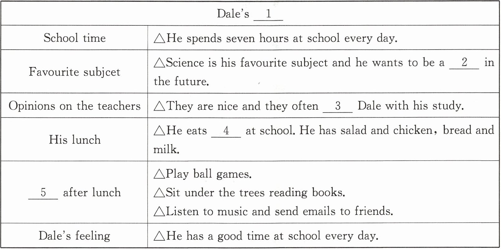 I am good at all my subjects. But my favourite subject is science, and I want to be a scientist in the future. All my teachers are very nice and helpful for my study. And my classmates are nice, too. I don't go home for lunch. I usually have a good meal at school with my friends. I like salad and chicken. I also have some bread and milk. After lunch, we often go to the sports field. Sometimes we play ball games, and sometimes we just sit under the trees reading books. Sometimes we go to the computer center to listen to music and send emails to our friends. Then we go back to the classroom to have classes in the afternoon.