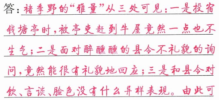 褚季野的“雅量”从三处可见:一是投宿钱塘亭时,被亭吏赶到牛屋竟然一点也不生气;二是面对醉醺醺的县令不礼貌的询问,竟然能很有礼貌地回应;三是和县令对饮、言谈、脸色没有什么异样表现。由此可见,“雅量”是一种宽宏的气量,是喜怒不形于色、是宠辱不惊的修养。