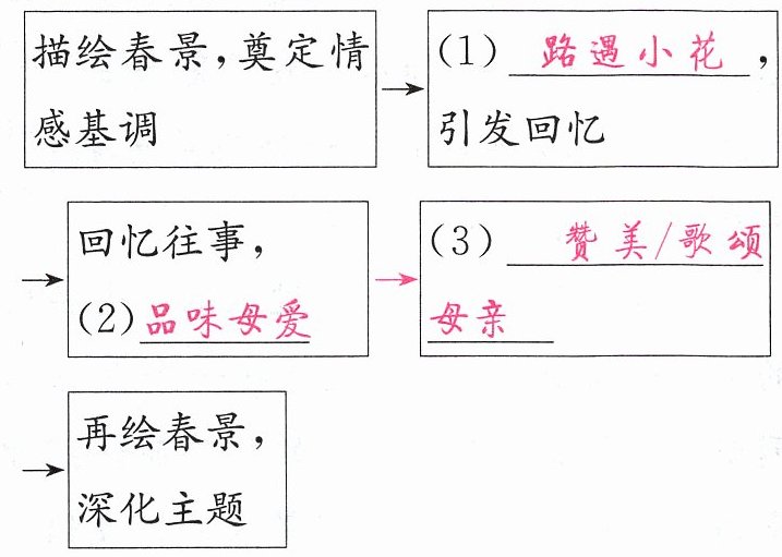 路遇小花; 品味母爱; 赞美/歌颂母亲; “盘算”指心里算计或筹划;“撬开”指把根棒等的一头插入缝中或孔中,用力扳或压另一头,使东西移动或分开。用这两个词写花,运用了拟人的修辞手法,生动形象地写出了紫藤的蓄势待放和梅花、迎春花不畏严寒早早开放的样子。; 运用了拟人和比喻的修辞手法,生动形象地写出了田间的蓝色小花生机勃勃、开得很灿烂的样子,表达了“我”见到灿烂的小花时候的惊喜。; ①立春了,回家的田间小路上开满了灿烂的婆婆纳;②在回家的路上,“我”回想起成长过程中母亲“我”无微不至的爱,③母亲积极乐观的生活态度和美好品质对“我”的感染,感到如春天般明亮而温暖,引领着我迈向朴素真实的生活。