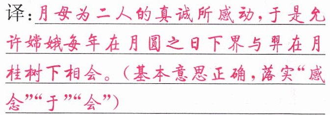 月母为二人的真诚所感动,于是允许嫦娥每年在月圆之日下界与羿在月桂树下相会。(基本意思正确,落实“感念”“于”“会”)