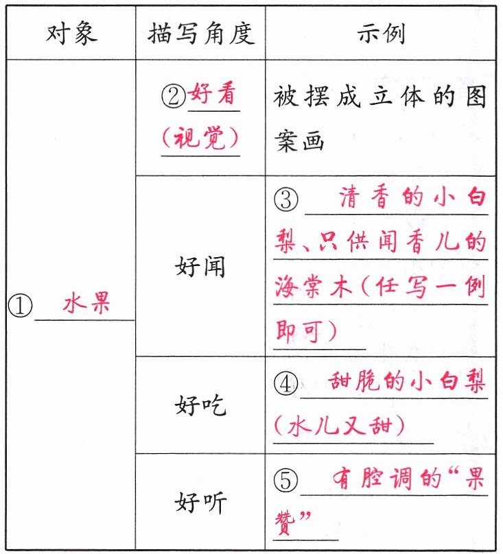 14.阅读第②至④段,完成下面的表格。 对象 描写角度 示例 ① 水果 ② (视觉) 被摆成立体的图案画 好闻 ③ 清香的小白梨、只供闻香儿的海棠木(任写一例即可) 好吃 ④ 甜脆的小白梨(水儿又甜) 好听 ⑤ 有腔调的“果赞”