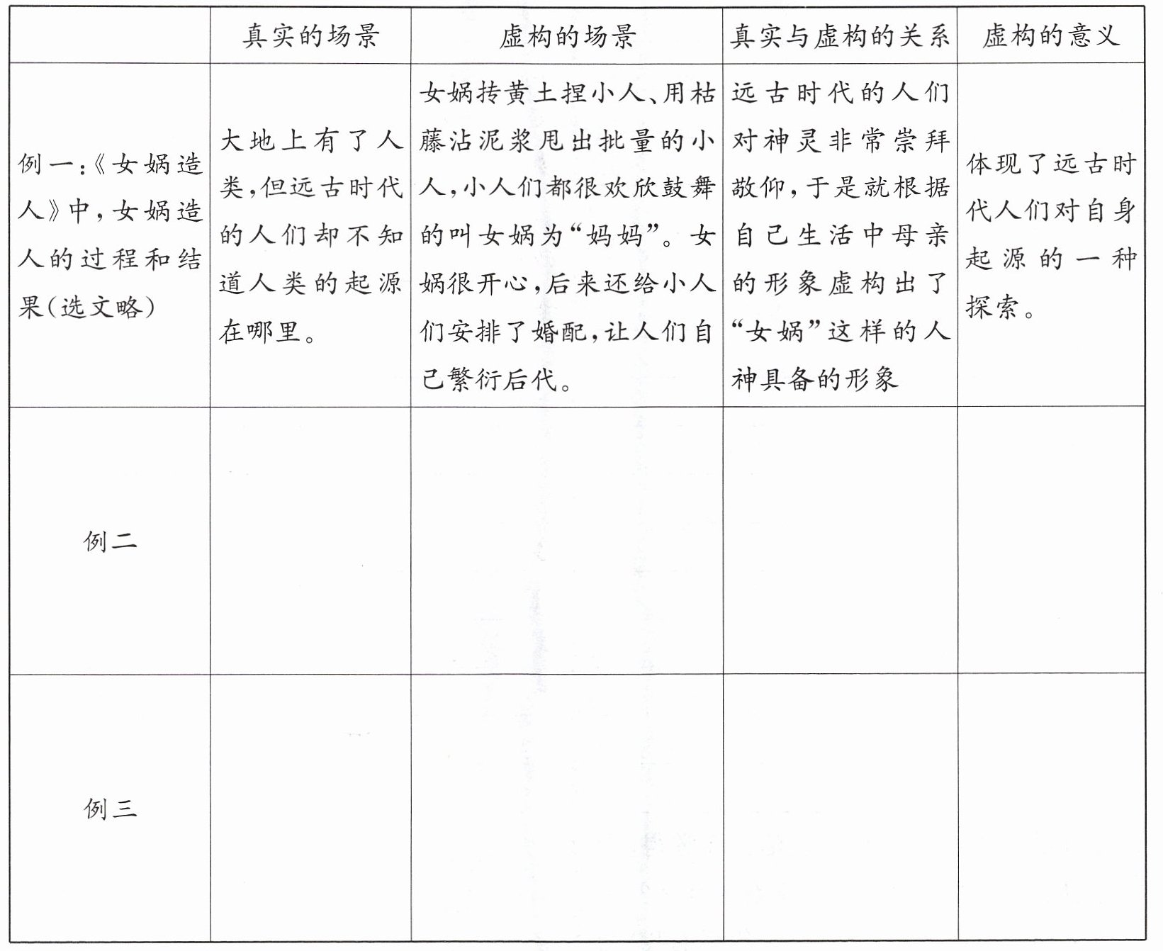 本单元的课文讲述了一个个引人入胜的故事,展现了非凡的想象力。选择一个最吸引你的故事,试着通过下列表格,结合具体的内容,去体会故事中神奇美妙的想象,去探寻课文是如何基于现实展开想象,又通过想象来反映现实的。仿照示例,完成下列表格,完善你的研读的成果吧!