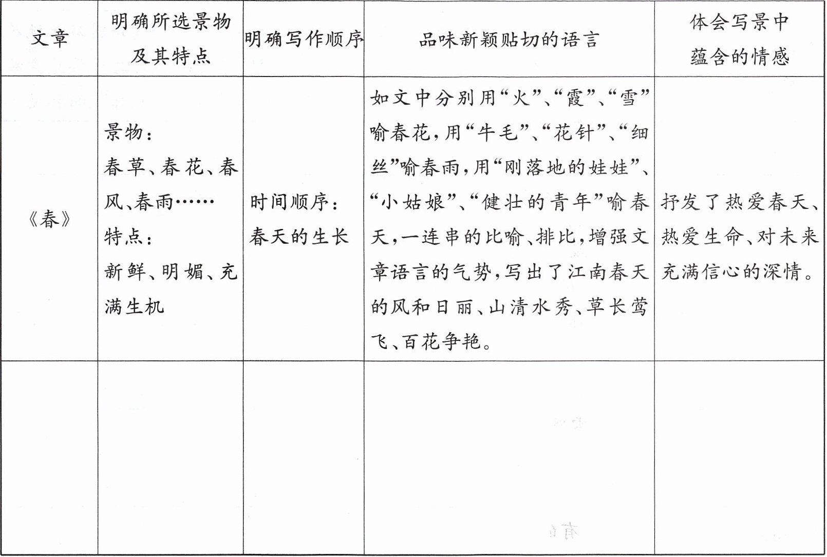|《济南的冬天》|景物:山(阳光朗照下的山、薄雪覆盖下的山、城外远山)、水、阳光……特点:温晴、慈善、美丽|空间顺序:总写济南冬天“温晴”的特点→分写山景→分写水景|如文中用“老城安适地睡着”“薄雪害了羞”等拟人手法,写出济南冬天的温暖安适与娇美;用“整个的是块空灵的蓝水晶”比喻水天,写出济南冬天的清澈透明,语言生动形象,充满生活气息。|抒发了对济南冬天的喜爱和赞美之情。|